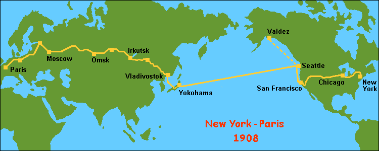 La competición estaba organizada por los periódicos New York Times y Le Matin y se inspiraban en la carrera Pekín – París de 1907. La idea era alcanzar la ciudad de París lo antes posible dirigiéndose hacia el oeste, todo por carreteras, obviamente habilitadas aun entonces solo para caballos y con la única salvedad de cruzar en ferry el Estrecho de Bering por Alaska en dirección hacia Siberia, un territorio por el que ningún automóvil había circulado todavía. Después llegarían a Moscú, San Petersburgo, Berlín y finalmente París. ¿El premio? Simplemente un trofeo y, sobre todo, el placer de haberlo conseguido.